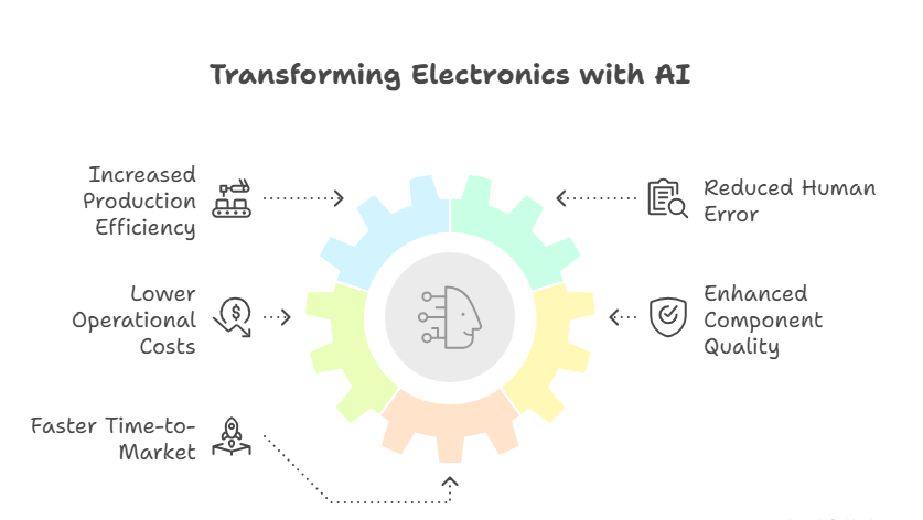 AI in electronics focuses on making processes smarter and more efficient. From predicting equipment failures to optimizing production schedules, AI is helping manufacturers make data-driven decisions. It improves everything from circuit design to final product inspection, leading to higher efficiency and reduced costs.