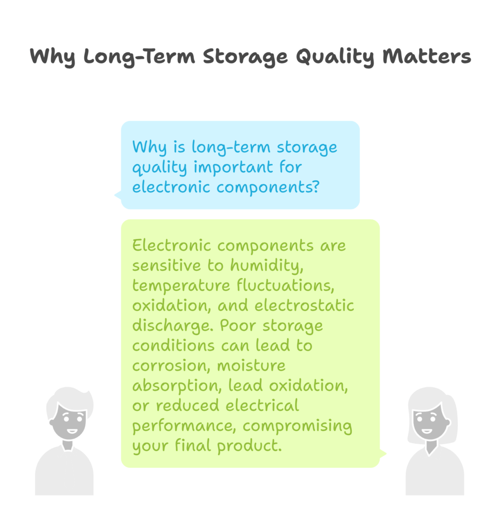 Electronic components are sensitive to humidity, temperature fluctuations, oxidation, and electrostatic discharge. Poor storage conditions can lead to corrosion, moisture absorption, lead oxidation, or reduced electrical performance — all of which can compromise your final product.