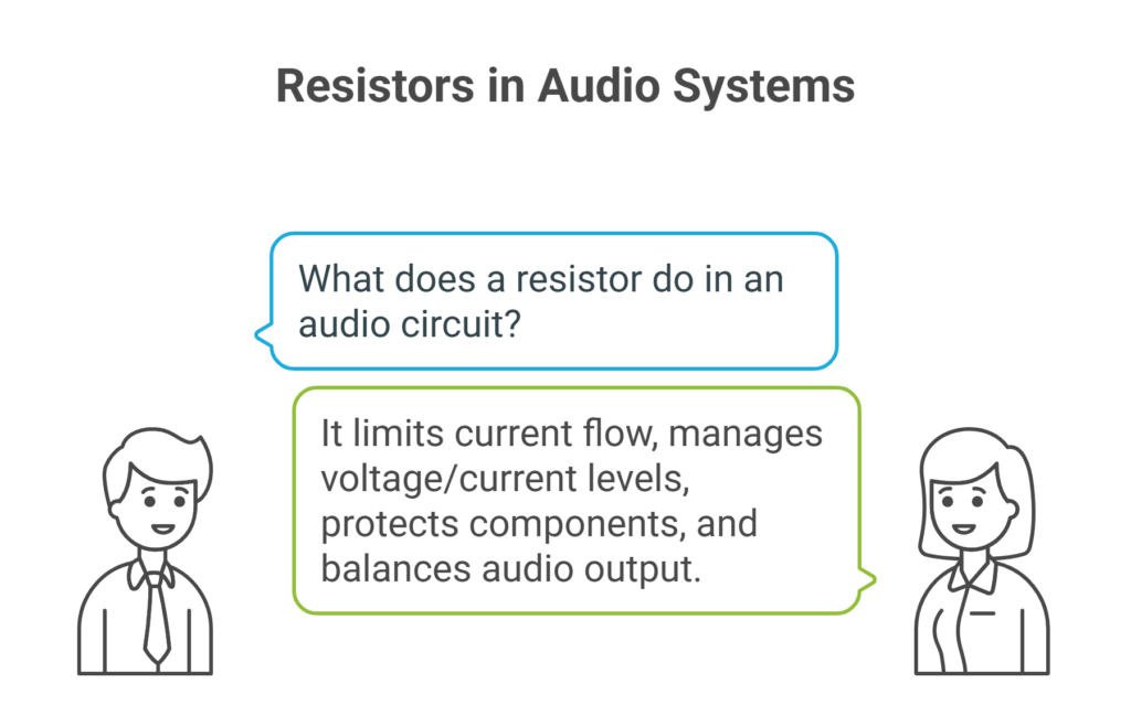 A resistor limits or controls the flow of current in a circuit. In audio systems, resistors help manage voltage and current levels to protect sensitive components and balance audio output. They ensure that the right amount of current reaches each part of the circuit, preventing signal distortion and overheating.