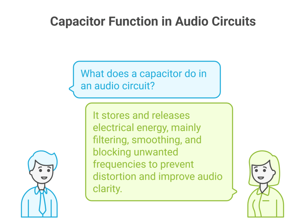 A capacitor stores and releases electrical energy. In audio circuits, it’s mainly used to filter, smooth, and block unwanted frequencies. Capacitors act like small energy reservoirs that control how signals move through the circuit, preventing distortion and improving audio clarity.