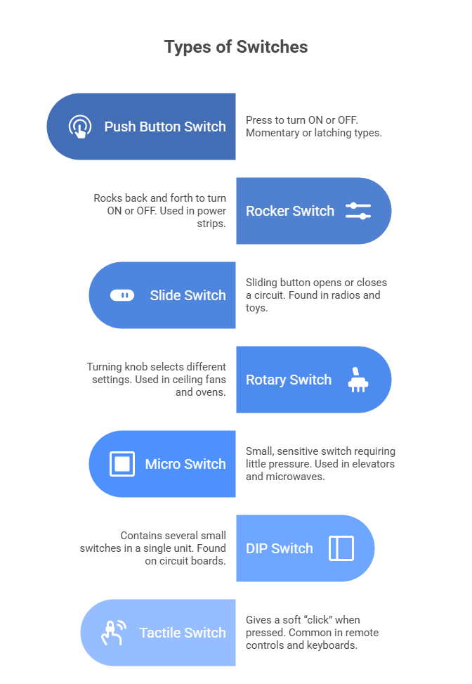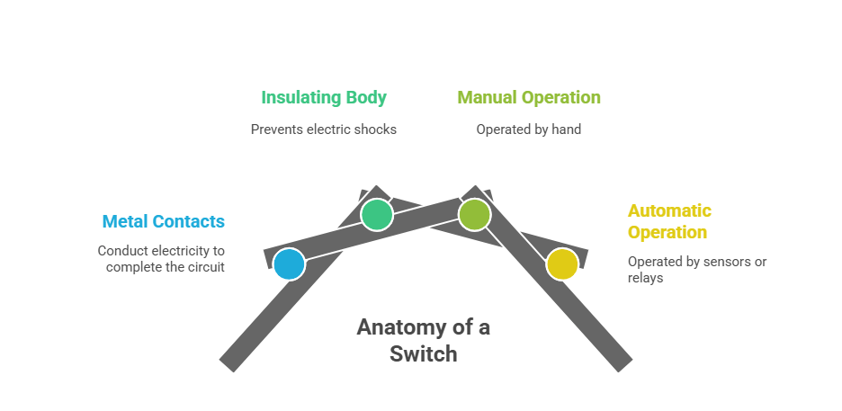 Some switches are operated by hand, like the ones we use in homes, while others work automatically using sensors or control systems in advanced machines.